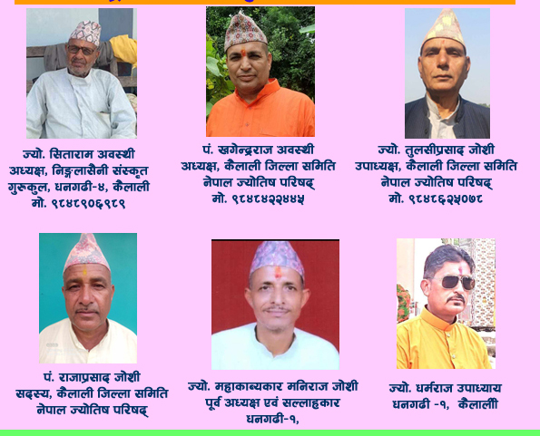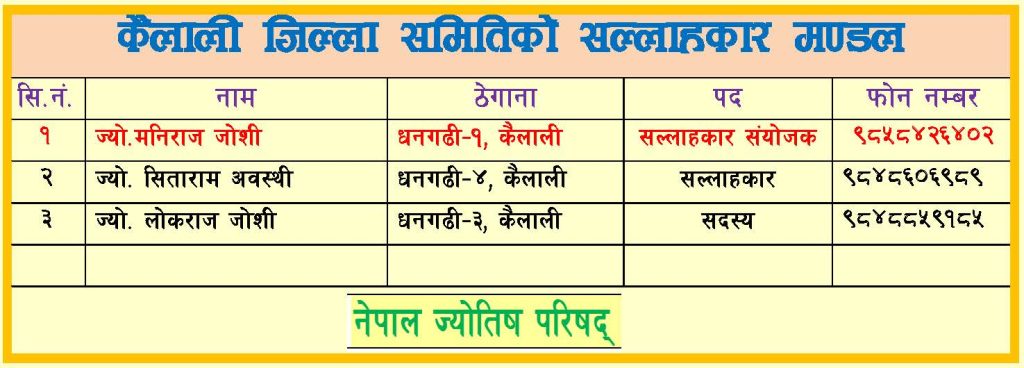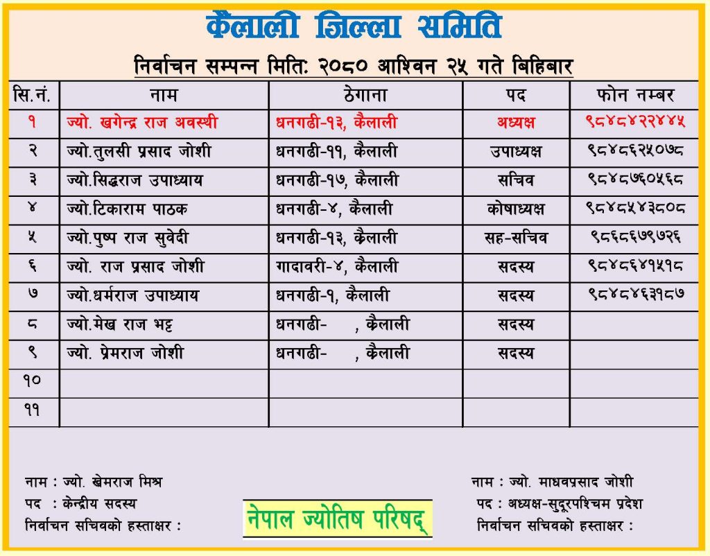 कैलाली जिल्ला समिति ज्यो. खगेन्द्र राज अवस्थी अध्यक्षसम्पर्क : ९८४८४२२४४५कैलाली जिल्ला समिति ज्यो.तुलसी प्रसाद जोशी उपाध्यक्ष सम्पर्क : ९८४८६२५०७८कैलाली जिल्ला समिति ज्यो.सिद्धराज उपाध्याय सचिवसम्पर्क :९८४८७६०५६८कैलाली जिल्ला समिति ज्यो.टिकाराम पाठककोषाध्यक्षसम्पर्क : ९८४८५४३८०८कैलाली जिल्ला समिति ज्यो.पुष्प राज सुवेदी सहसचिव सम्पर्क : ९८६८६७९७२६कैलाली जिल्ला समिति ज्यो. राज प्रसाद जोशी सदस्यसम्पर्क :९८४८६४१५१८कैलाली जिल्ला समिति ज्यो.धर्मराज उपाध्याय सदस्यसम्पर्क : ९८४८४६३१८७कैलाली जिल्ला समिति ज्यो.मेख राज भट्ट सदस्यसम्पर्क : कैलाली जिल्ला समिति ज्यो. प्रेमराज जोशी सदस्यसम्पर्क : कैलाली जिल्ला समिति ज्यो. मनिराज जोशी सल्लाहकार संयोजकसम्पर्क : ९८५८४२६४०२ कैलाली जिल्ला समिति ज्यो. सिताराम अवस्थी सल्लाहकारसम्पर्क : ९८४८६०६९८९ कैलाली जिल्ला समिति ज्यो. लोकराज जोशी सल्लाहकार सम्पर्क : ९८४८८५९१८५ कैलाली जिल्ला समिति